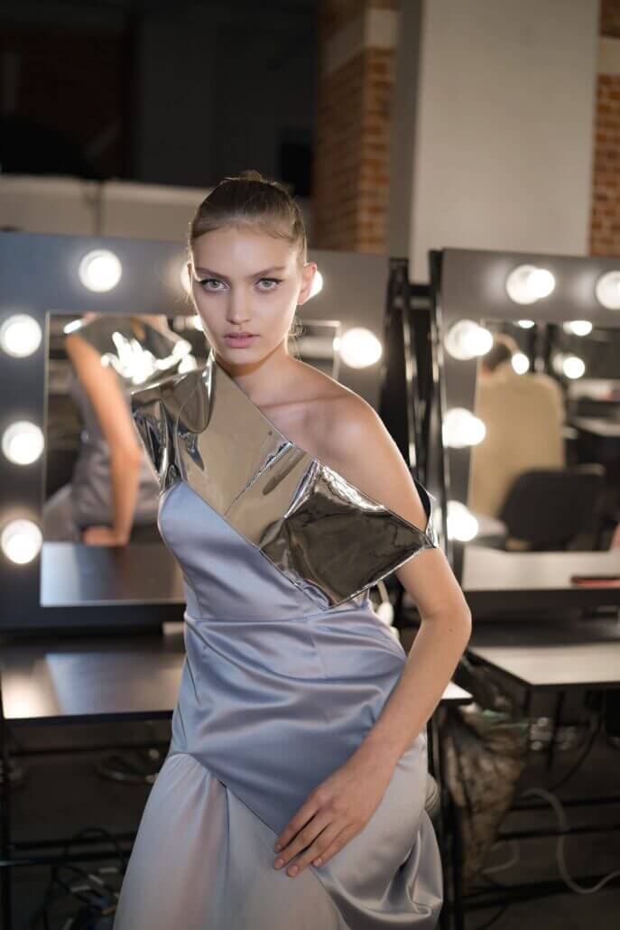 В новой коллекции Алёны Нега «Mirror» зеркало становится главной темой, благодаря чему вечерние образы в сочетании с архитектурными линиями становятся ещё более необычными. Сияние зеркальных, жестких поверхностей контрастирует с прозрачностью шифона и органзы, за счёт чего футуристичные силуэты становятся женственными. Все оттенки серых и серебристых цветов подчеркивают авангардный крой.