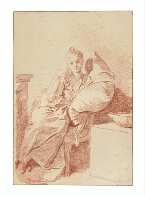 «Рисунок с изображением молодой девушки скорее всего представляет любимую дочь художника Розали, родившуюся в 1769 году, хотя есть предположения, что на рисунке изображена супругу мастера – Мари-Анн. Рисунок причислен к группе произведений, которые могли быть созданы для гравировки в виде популярных в то время оттисков.